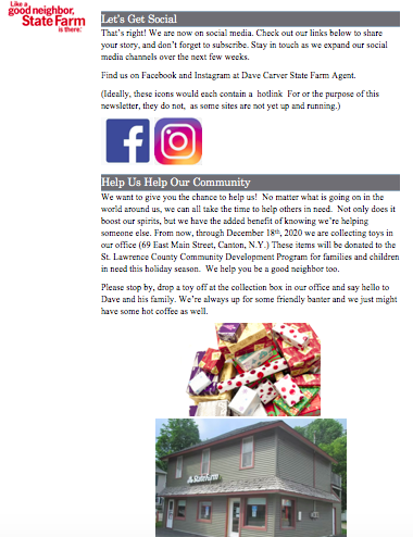 Concepted and developed Instagram posts, CSR (Corporate Social Responsibility) storyboard frames and an email newsletter for real-world client (Dave Carver’s State Farm branch), as part of the tactics to support his objective to reach more millennial clients.